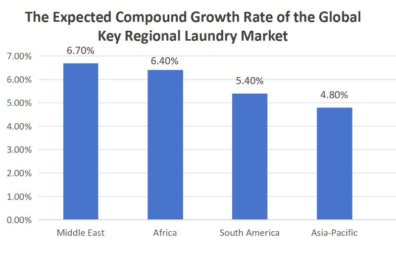 Ke depan, Timur Tengah dan Afrika diperkirakan akan menjadi wilayah dengan pertumbuhan tercepat untuk pasar layanan dry cleaning dan pencucian air dengan CAGR masing-masing sebesar 6,7% dan 6,4%. Amerika Selatan dan Asia-Pasifik berada di urutan berikutnya, dengan CAGR pasar masing-masing sebesar 5,4% dan 4,8%.