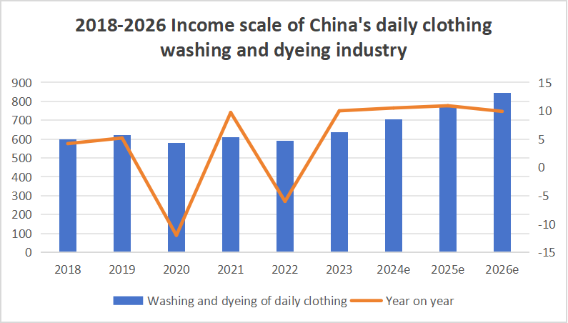 Sebagai bagian dari layanan dasar untuk memenuhi kebutuhan hidup masyarakat sehari-hari, industri pencucian dan pewarnaan terus tumbuh dengan mantap sejak berakhirnya epidemi, dan ukuran pasarnya terus berkembang. Pada tahun 2023, pendapatan operasional tahunan Tiongkok mencuci dan industri pewarnaan mencapai 129,06 miliar yuan. Diantaranya, layanan pencucian dan pewarnaan pakaian harian menyumbang 49,4% dari pendapatan tahunan industri, mencapai 63,76 miliar yuan, yang telah pulih ke periode yang sama pada tahun 2019. Menurut perkiraan, pada tahun 2026, pendapatan tahunan perusahaan setiap hari sektor pencucian dan pewarnaan pakaian akan melebihi 80 miliar yuan, dengan tingkat pertumbuhan gabungan hampir 10%.